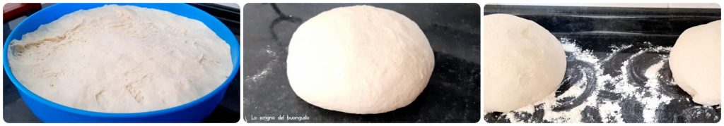 Na voltooiing van het rijzen, het deeg overbrengen op een met bloem bestoven werkblad en het kort kneden om opnieuw een bal te vormen, verdeel het in twee delen, waarvan één groter is dan de andere en vorm twee balletjes.