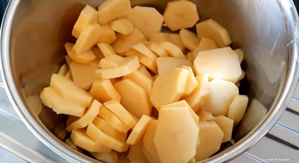Terwijl de aardappelen koken, neem een antiaanbakpan, doe de extra vergine olijfolie en een teentje knoflook erin, laat het fruiten en voeg de goed schoongemaakte, gewassen en uitgelekte snijbiet toe en laat ongeveer tien minuten koken, af en toe roeren.