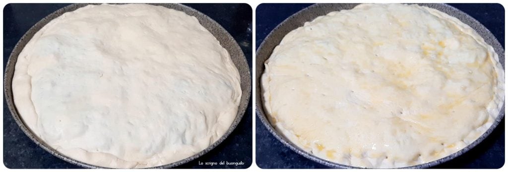 Laat minstens 30 minuten rusten en prik de taart in het oppervlak met een vork, sla dan een eidooier met een scheutje water in een glas en smeer het over de pizza.