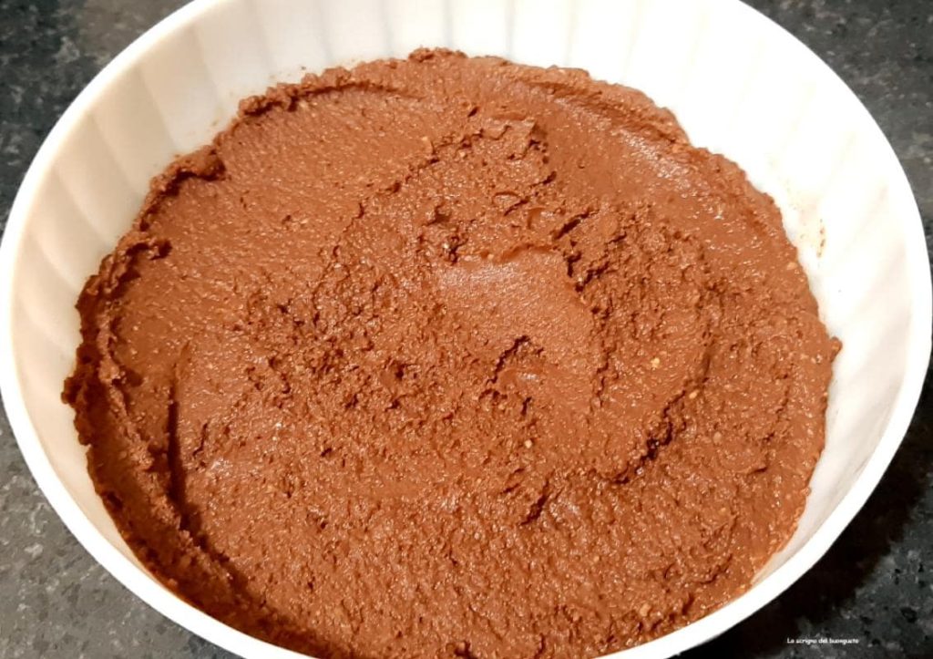 We beginnen de vulling met cacao en kikkererwtenpuree te bereiden door de kikkererwten simpelweg met water te koken zonder iets toe te voegen, zodra ze gekookt en afgekoeld zijn, doe ze in de keukenmachine, voeg rum, cacao en suiker toe.