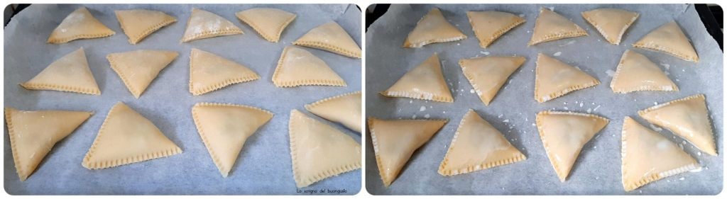 Als we zonder vormpjes werken, snijden we rondjes uit met een deeguitsteker of een glas, op elk rondje leggen we een royale theelepel vulling, licht aandrukken, en dan bedekken met een ander cirkel van zanddeeg en de randen goed afdichten.