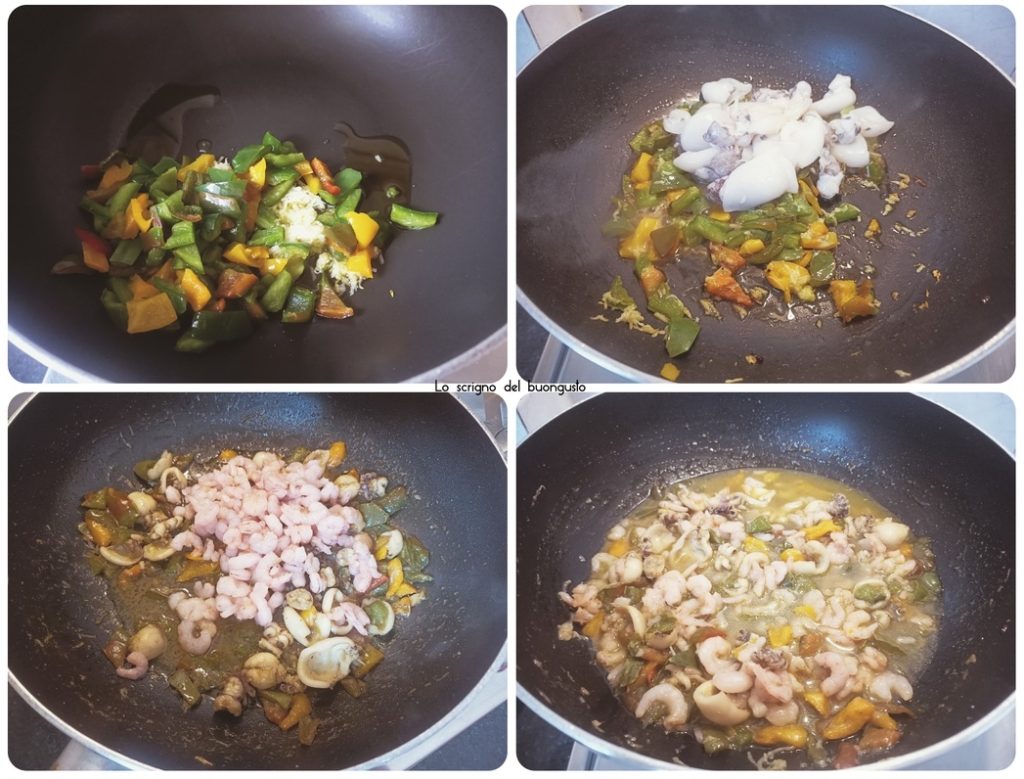 Doe in een anti-aanbakkoekenpan de extra vierge olijfolie, voeg de fijngesneden (of hele) teentjes knoflook toe en laat licht kleuren, voeg de paprika in zeer kleine stukjes toe en laat enkele minuten garen.