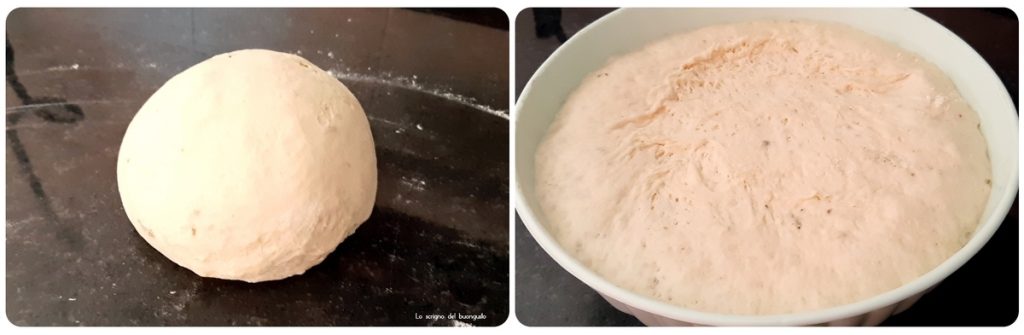 Laat de bolletjes ongeveer 30 minuten rijzen, vorm vervolgens lange ‘lingue’ van het deeg en leg ze op een bakplaat van ongeveer 30 x 40 cm waar er 2 naast elkaar passen in de lengterichting. Maak een iets steviger randje en laat nog 15 minuten rusten.