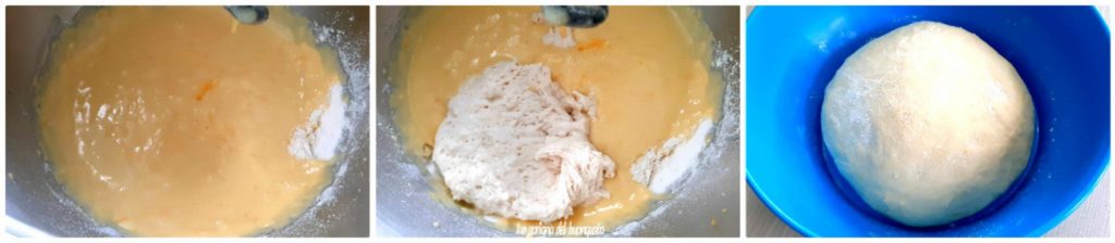 • We bereiden het tweede deeg met 3 eieren, 120 g suiker, 100 g boter, de geraspte schil van 1 citroen, 1 glaasje rum, 100 ml melk, het zout en 200 g bloem die nodig is om het deeg een beetje te binden, genomen van de 700 g totaal benodigd voor het tweede deeg.