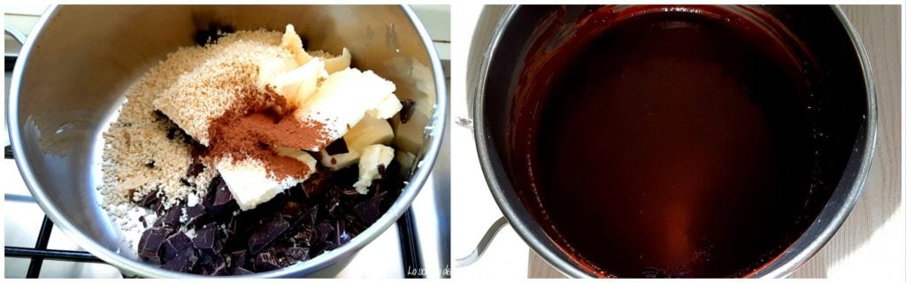 Wanneer de rijstijd bijna voorbij is, beginnen we het vullen voor te bereiden door de chocoladestukjes, de gehakte amandelen, de boter en de gemalen kaneel in een pan te doen en te smelten op laag vuur.