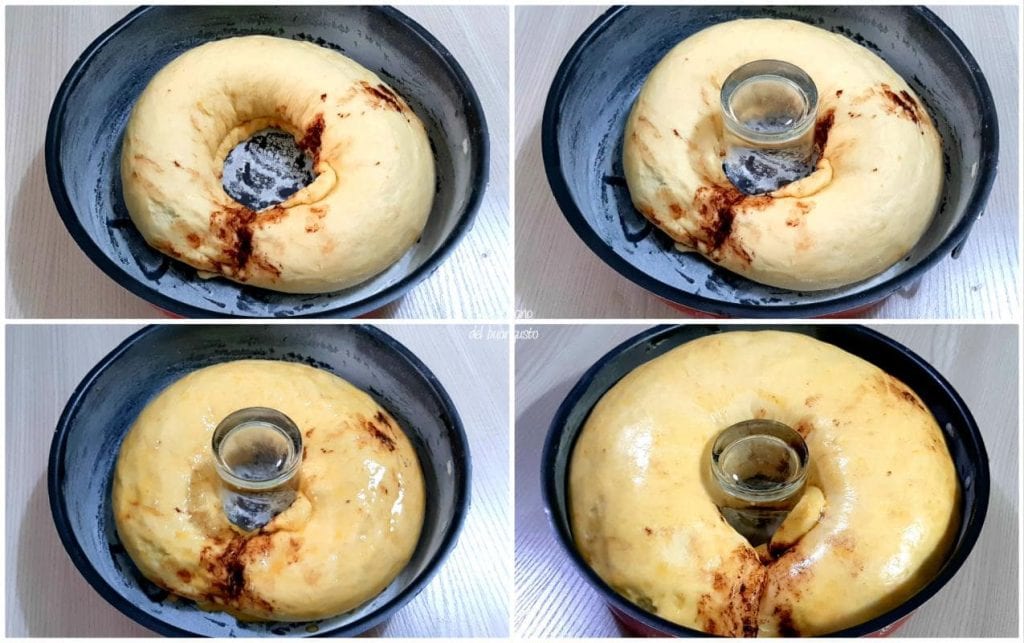 Verplaats het dessert naar een ingevette en met bloem bestoven tulbandvorm van ongeveer 32 cm, plaats een glazen beker in het midden om de vorm van de krans in het midden te behouden, bestrijk het oppervlak met 1 losgeklopte dooier + een scheutje melk.