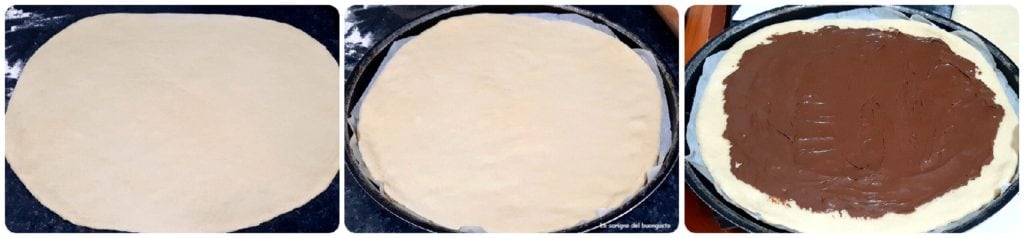 Plaats het op de Nutella, er blijft een beetje deeg over langs de randen, bevochtig de overhangende rand en sluit de taart om af te sluiten.