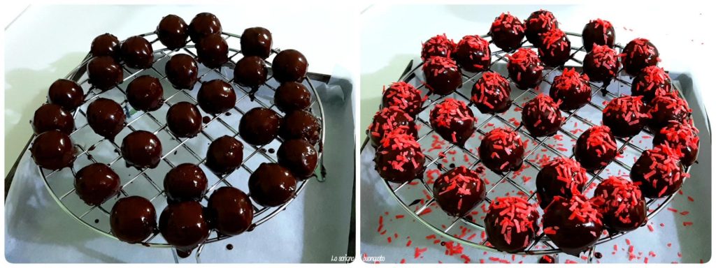 Bereid een rooster voor om onze truffels op te laten drogen, haal de balletjes uit de koelkast, doop ze met behulp van een tandenstoker in de chocolade en leg ze op het rooster om te drogen.