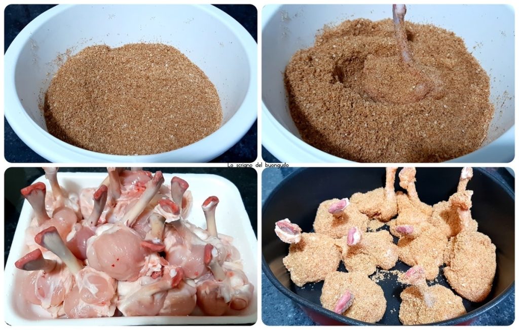 Ik liet mijn man de vleugels pellen en maakte balletjes van het vlees dat van boven naar beneden gezakt was, om ze vervolgens te paneren met paneermeel en paprika.