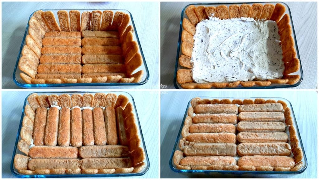 Nu dopen we opnieuw een voor een de savoiardi om een andere laag te maken, gieten we opnieuw het mengsel en bedekken het met de gedoopte savoiardi.