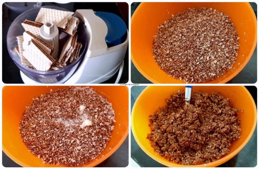 • Bereid de basis van de taart door 300 g wafels fijn te malen, voeg dan 60 g boter toe en meng goed.