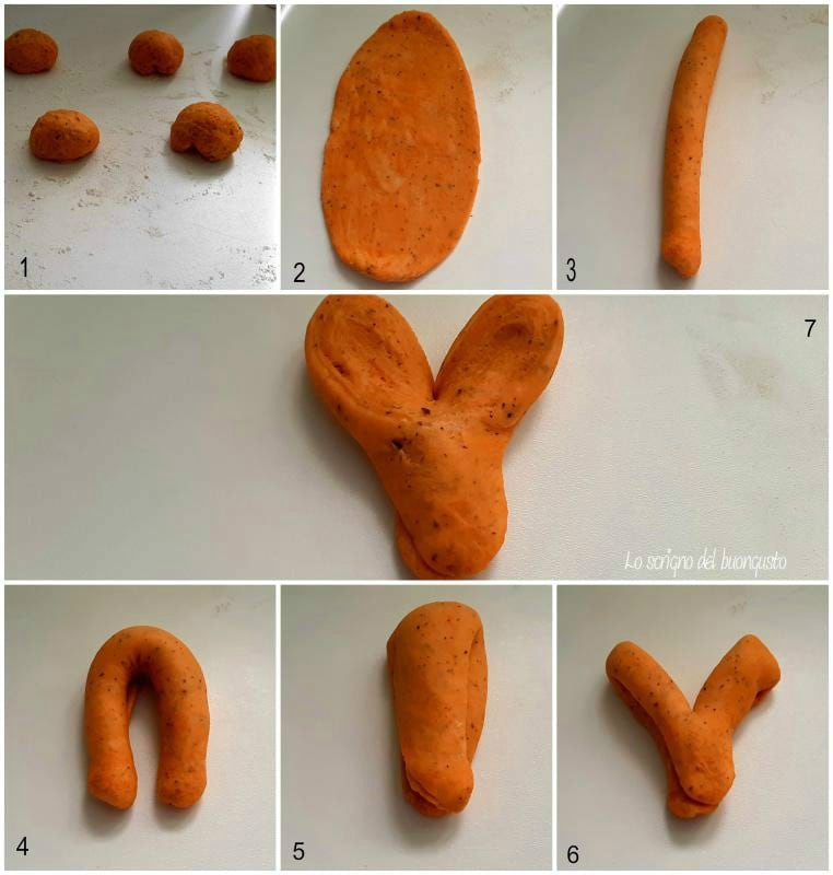 Rol elk bolletje met een deegroller uit tot een langwerpige vorm, maak er een lint van en rol het van de bredere kant op tot een koord; vouw het dan in tweeën met de uiteinden naar ons toe, vorm het lichtjes met de hand zodat het geheel blijft, snij dan een helft in als een Y, draai het gesneden deel naar boven en het hart is gevormd.