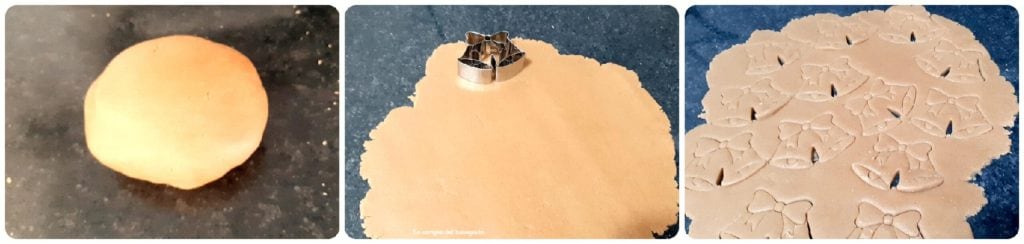 vervolgens de uitgestoken koekjes op een met bakpapier beklede bakplaat leggen en in een voorverwarmde oven op 180°C gedurende ongeveer 11-12 minuten bakken.