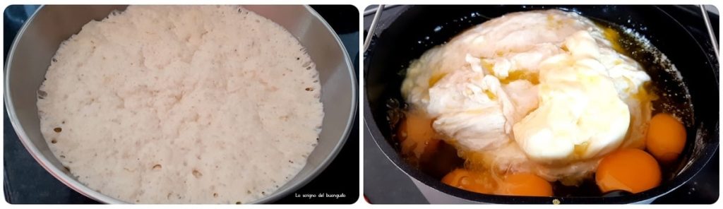Doe eerst de gist in een kom, voeg het water toe en laat het oplossen, voeg dan de bloem toe tot er een vrij dun beslag ontstaat.