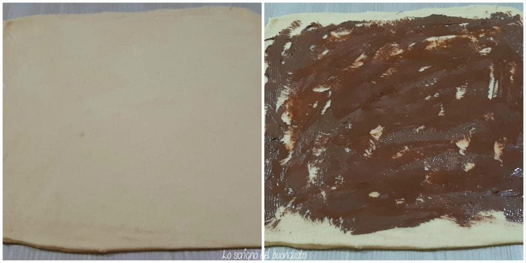 Op dit punt rol je het deeg opnieuw uit om een vel te krijgen, vul het met Nutella of met extra pure chocoladeblokjes die zijn verzacht… ik heb het meerdere keren gedaan in beide versies van de vulling.