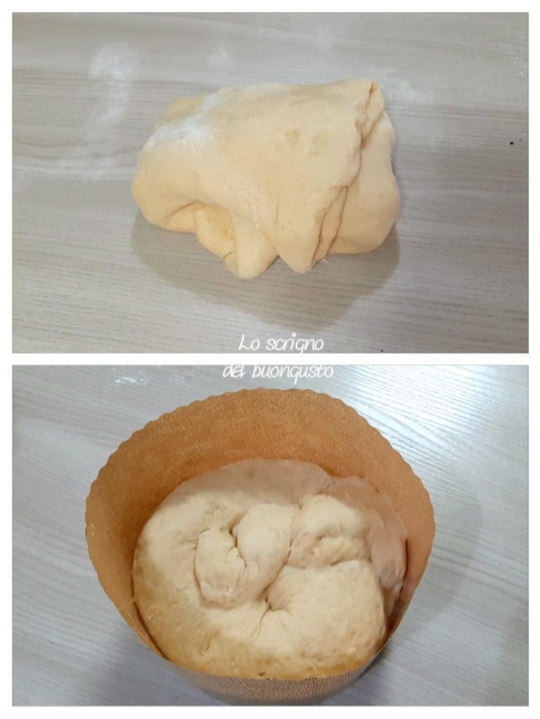 Neem een papieren mal voor panettone van 1 kg en doe het deeg erin, druk het lichtjes aan om het deeg een beetje gelijk te maken en laat het ongeveer een uur rijzen.
