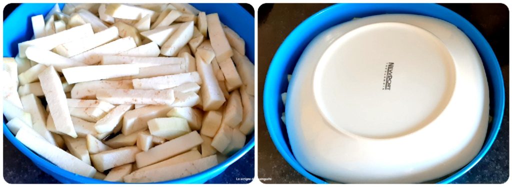 …daarna laat ze uitlekken in een vergiet en laat ze ongeveer 2 uur staan.
