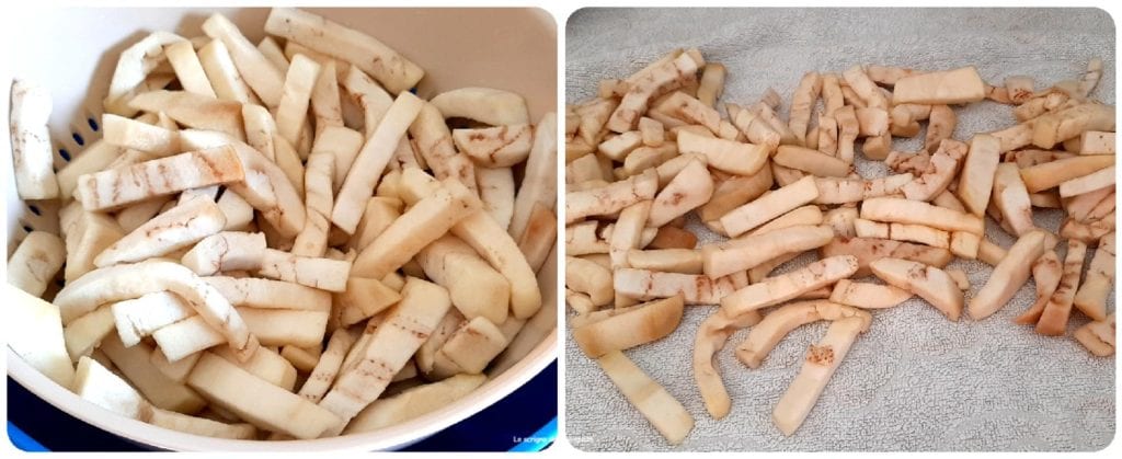Snijd eerst de uiteinden van de aubergines, schil ze volledig, snijd ze vervolgens in plakken van ongeveer een vinger dik, snijd ze in reepjes die ook ongeveer een vinger dik zijn en leg ze in een ruime kom.