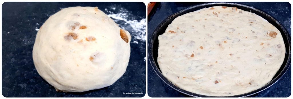 Los de gist op in een kom met het warme water, voeg dan een beetje meel toe, het ei en meng goed, voeg de kaantjes, het zout en de rest van het meel toe en werk het deeg goed door.
