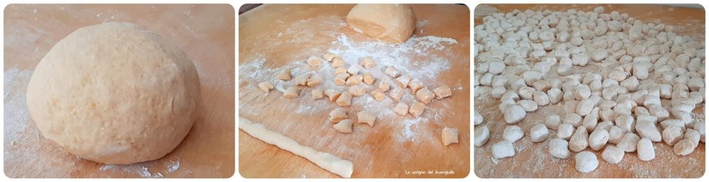 Voeg de pompoen toe aan de aardappelpuree, meng goed, voeg dan het ei toe terwijl je blijft mengen, voeg vervolgens nootmuskaat en peper toe en voeg beetje bij beetje de bloem toe om op een met bloem bestoven werkvlak verder te gaan.
