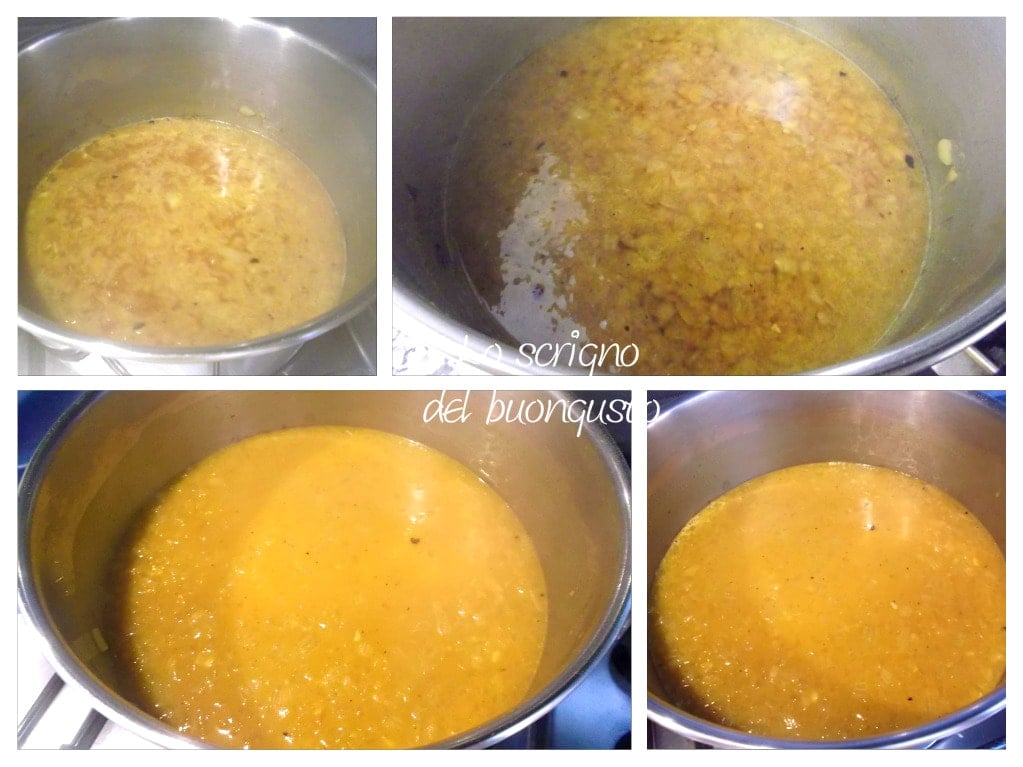 Voeg twee vingers water toe, de twee bouillonblokjes, de kurkuma, meng goed en laat koken.