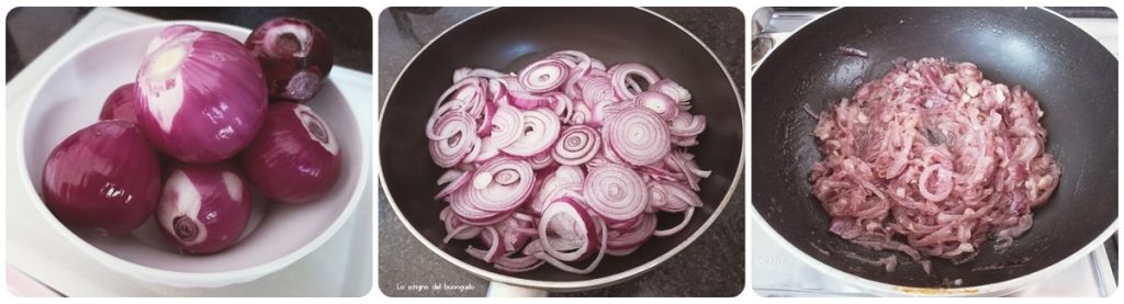 De keuze van de ingrediënten is cruciaal: rode uien, met hun zoete en licht aromatische smaak, worden dun gesneden en zacht gestoofd om hun smaak te versterken zonder de smeltende mozzarella te overheersen.