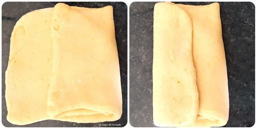 Het deeg kunnen we met de hand maken of met behulp van een planeetmenger, voeg in de kom van het deeg de melk, de zachte boter, het ei en de gist toe, laat de laatste oplossen en roer.