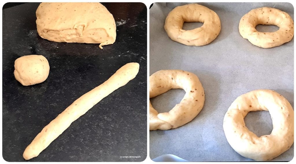 Vorm snoeren van ongeveer 2 vingers dik, sluit ze tot een donut en plaats ze op een bakplaat bekleed met bakpapier, zorg ervoor dat je ze een beetje uit elkaar houdt.