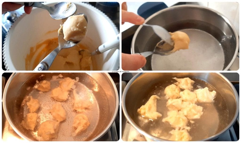 Breng het water aan de kook en vorm met behulp van twee theelepels gnocchi die iets groter zijn dan een walnoot, dompel ze ongeveer 3 minuten in het kokende water, of totdat ze boven komen drijven, en zorg ervoor dat ze niet aan elkaar plakken.