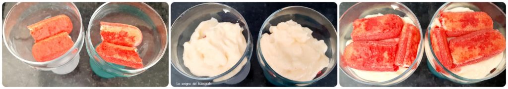 Doop de lange vingers in de alkermes en breek ze doormidden om de basis te maken, voeg dan ongeveer 2 volle eetlepels room toe, opnieuw de lange vingers en de room om te eindigen.