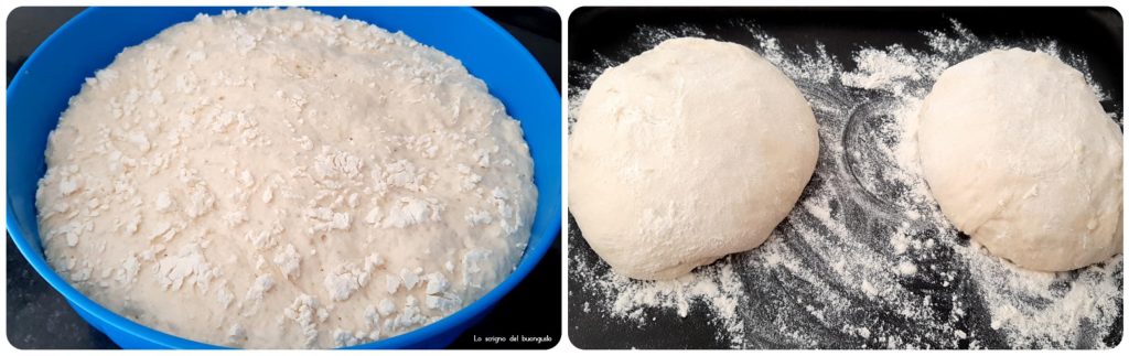 Als je wilt, kunnen we het ook direct in de kom bewerken om een bal te maken, deze vervolgens in tweeën te snijden en de twee verkregen ballen op de bakplaat te plaatsen.