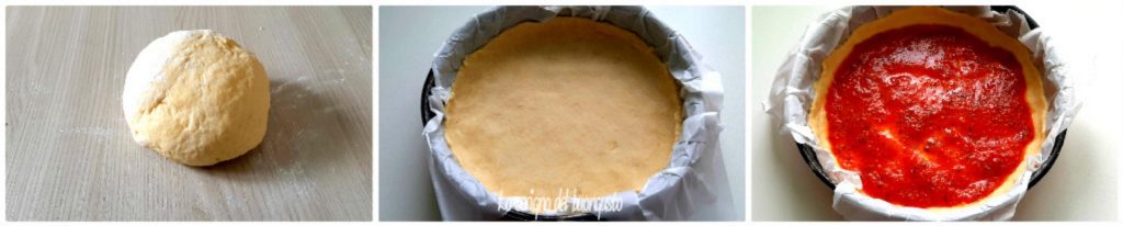 Doe nu in een kommetje 150 g gepelde tomaat, gezeefd door de zeef, of gebruik ingeblikte tomaten in blokjes gesneden, breng op smaak met oregano, extra vergine olijfolie, zout, meng goed en giet het op het pizzadeeg.