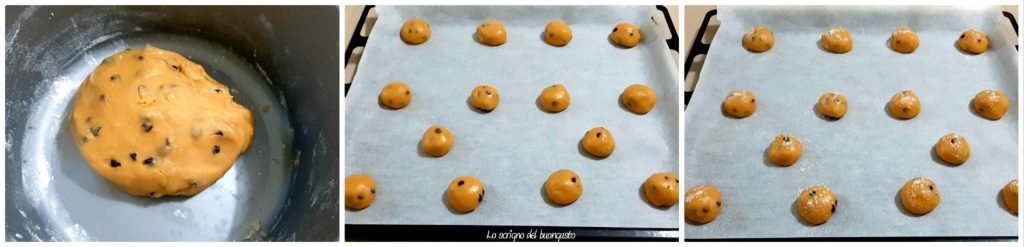 Meng in een kom alle ingrediënten behalve de chocolade en roer met een vork, voeg vervolgens de chocoladedruppels toe en voltooi het deeg door met bebloemde handen te kneden.