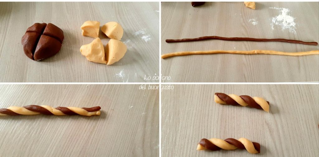 Zodra het deeg is gemaakt, verdeel het in twee gelijke delen en voeg aan één het cacaopoeder toe en vorm er touwtjes van, één voor elke kleur, en door ze met elkaar te verstrengelen ontstaan onze koekjes.