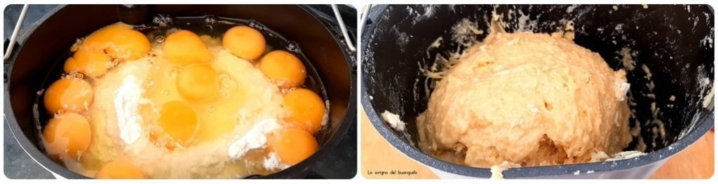 Ik heb een deeg gemaakt op basis van 12 eieren omdat ik het tijdens de kerstvakantie maakte, dus ik had veel nodig, maar je kunt er uiteraard minder maken.