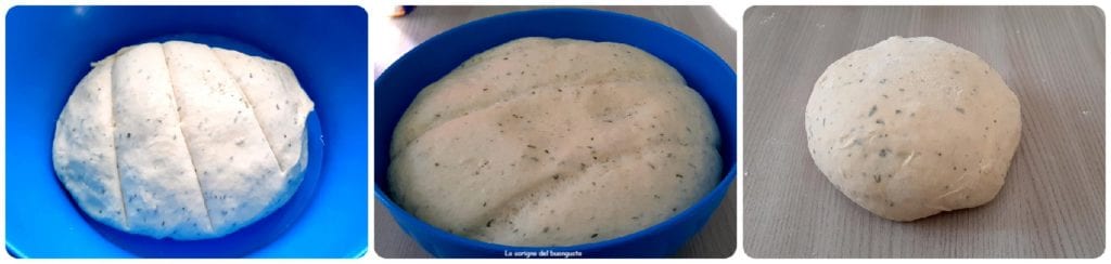 Zodra het deeg verkregen is, doe het in een grote kom, dek het af met huishoudfolie en laat het in de oven met het lampje aan rijzen voor ongeveer 3 uur, of totdat het in volume is verdubbeld.