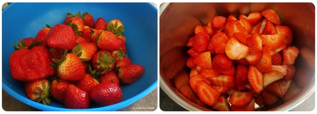 Was de aardbeien, verwijder de kroontjes, snijd ze in stukjes en doe ze in een pannetje…