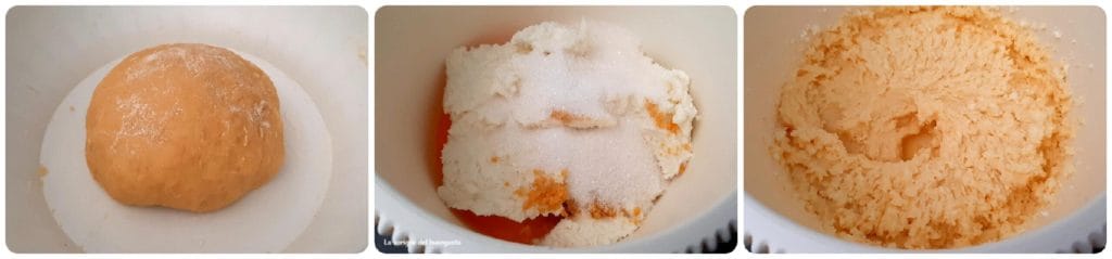 Allereerst maken we het zanddeeg door de eieren en de suiker in een grote kom te doen, goed te mengen en vervolgens beetje bij beetje de olie en de bloem toe te voegen totdat alles is opgenomen.