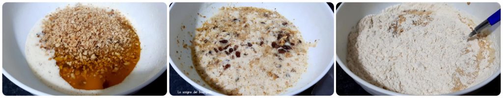 Voeg vervolgens de honing, extra vergine olijfolie, gehakte noten, geraspte citroen- en sinaasappelschillen toe.