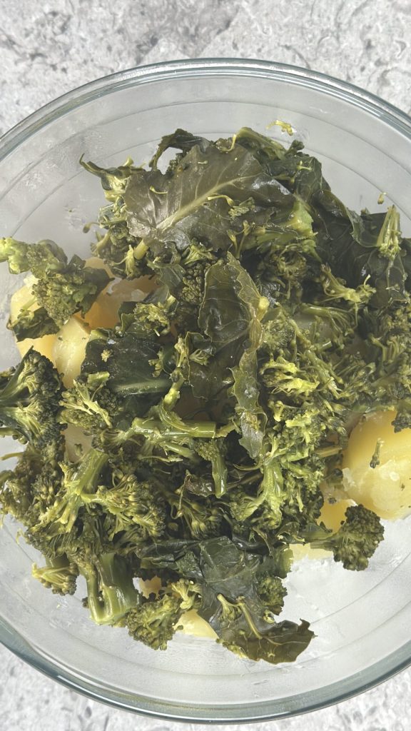 Stamp de broccoli en de aardappelen samen gedurende een paar minuten en let erop geen hele stukjes aardappel achter te laten.