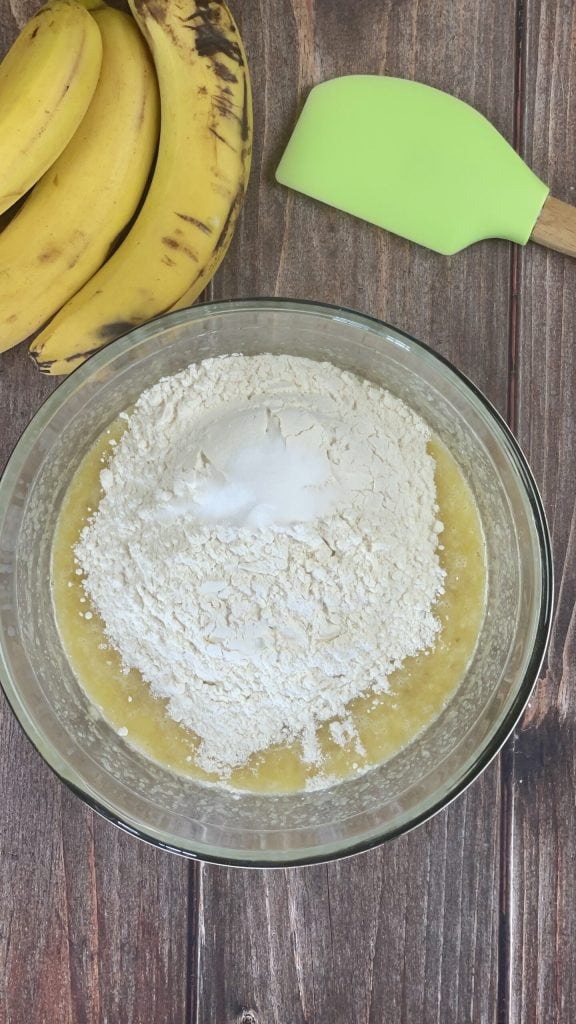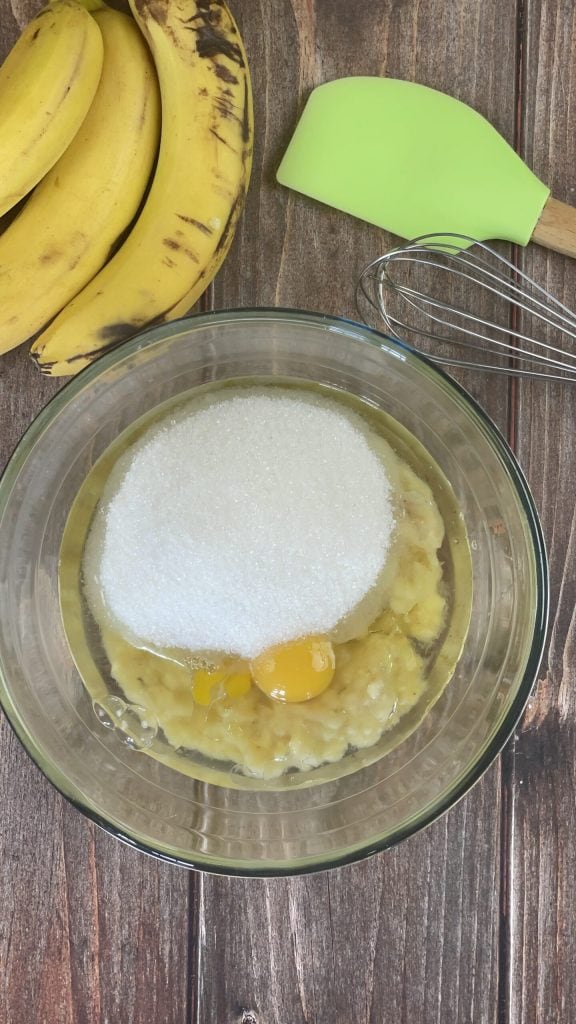 Begin de bereiding van het bananenbrood met aardbeien door de bananen te schillen en ze met een vork tot een puree te prakken.