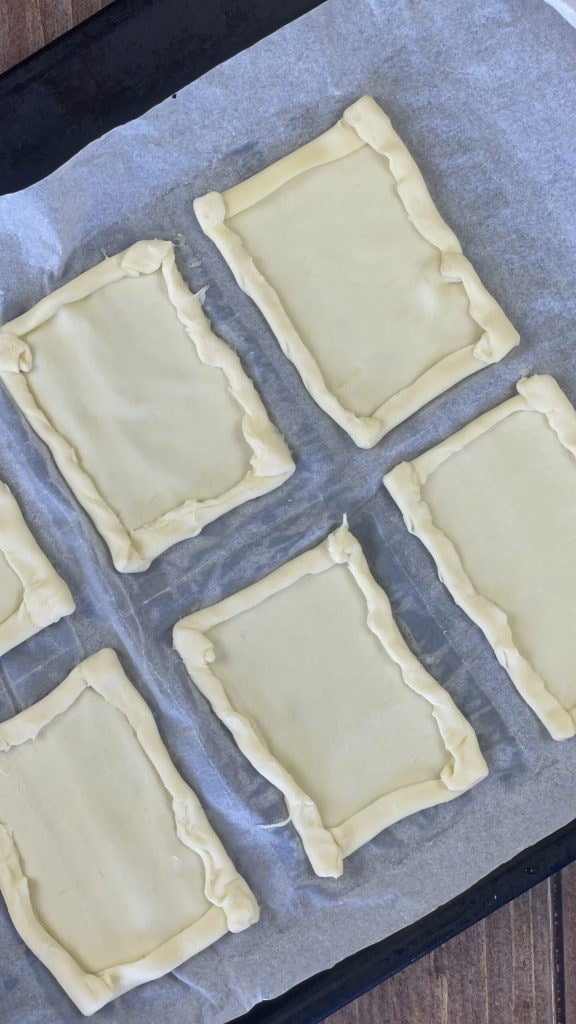 Vouw voor elk rechthoekig stuk bladerdeeg de randen goed om en druk ze aan met je vingers om te voorkomen dat ze tijdens het bakken omhoog komen.
