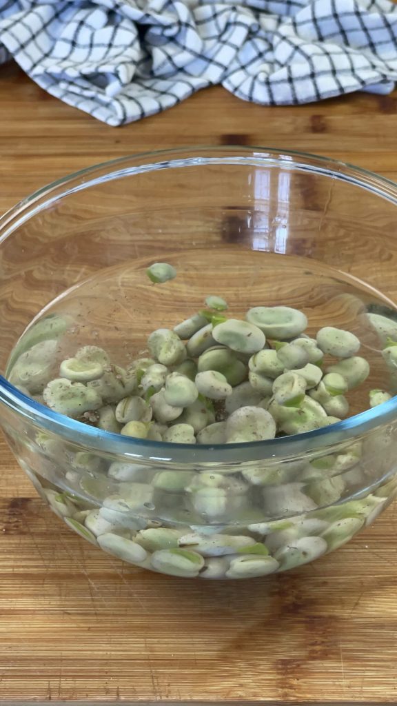 Eenmaal gekookt, giet de tuinbonen af in een kom met koud water en laat ze afkoelen.