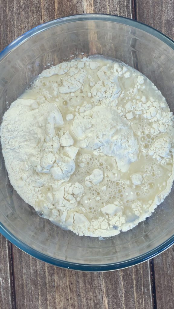 Begin met de bereiding van de Chinese dumplings op de plaat door de 00 bloem en het water in een kom te wegen.