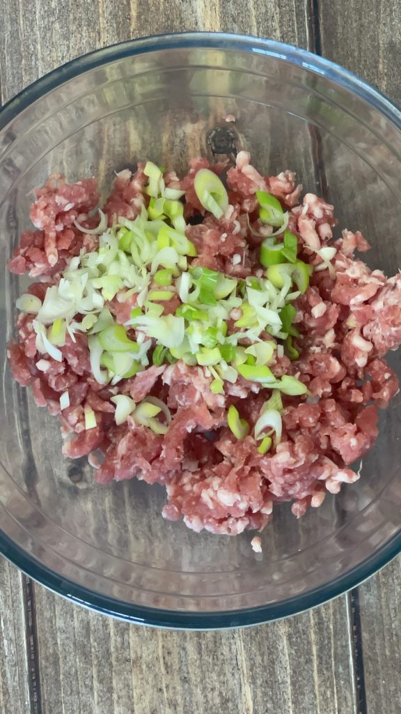 Voeg het toe aan het vlees en meng tot het volledig is opgenomen in de rest van de ingrediënten.Neem het deeg van de dumplings en rol het uit tot een rol van ongeveer 30 cm lang.