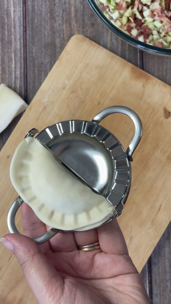 Voeg in het midden een lepel vulling toe.Sluit de vorm en druk stevig aan.