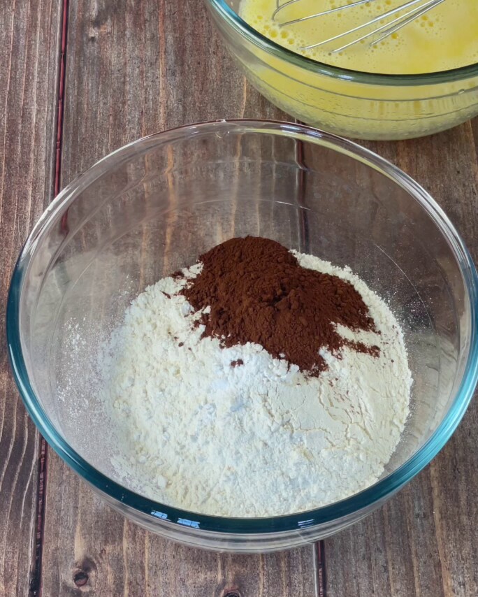 Mix met de garde om het mengsel te combineren.Weeg in een andere kom de bloem 00, het ongezoete cacaopoeder en het bakpoeder. Meng alles met een lepel en probeer eventuele poederklontjes te breken.