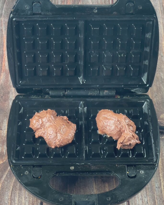 Voeg 1 of 2 lepels beslag toe aan elke uitsparing.Bak de wafels 3-4 minuten, ik heb ze 4 minuten gebakken omdat ik ze graag iets “krokant” aan de buitenkant heb.