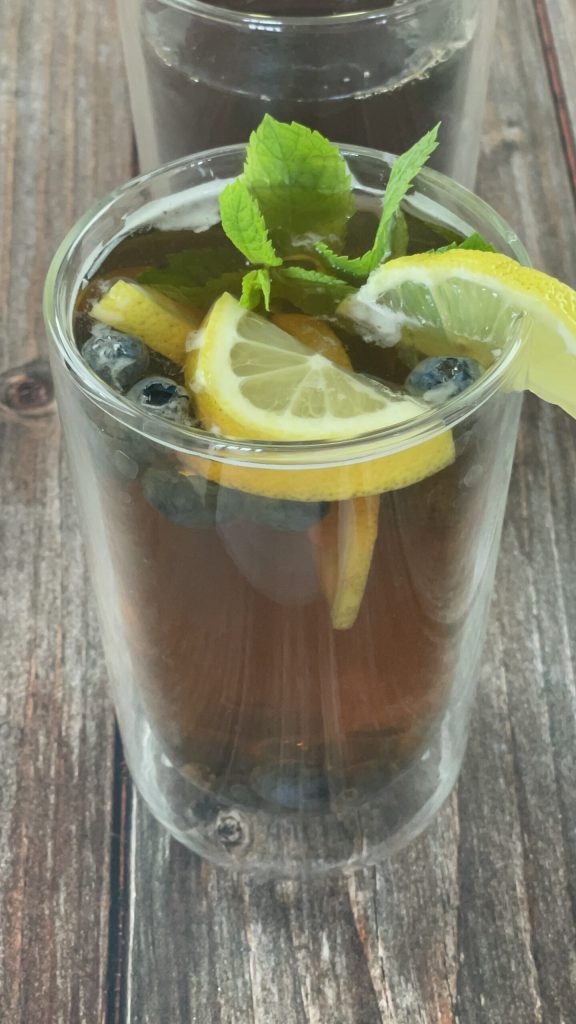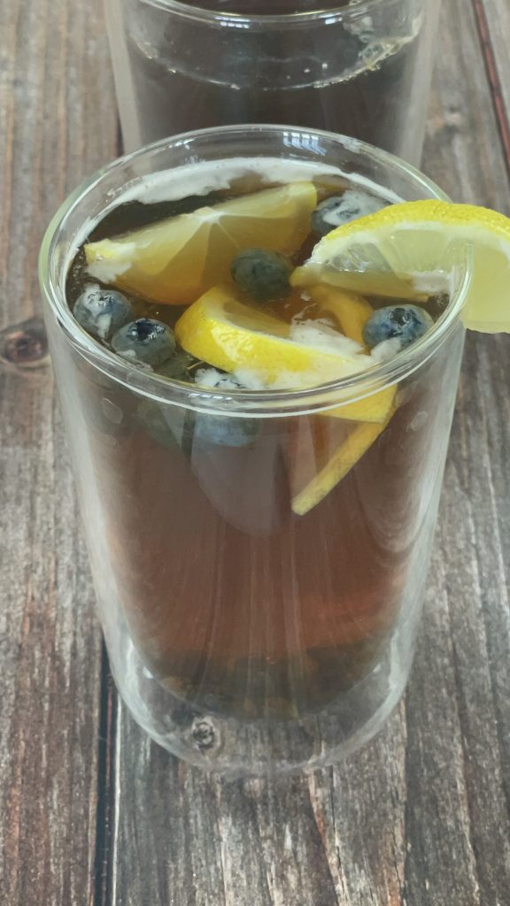 Citroen- en bosbessenthee, een drank die de verfrissende en dorstlessende eigenschappen van thee combineert met de voordelen van citroen en bosbessen, waardoor een mix met een fruitige en lichtzure smaak ontstaat.