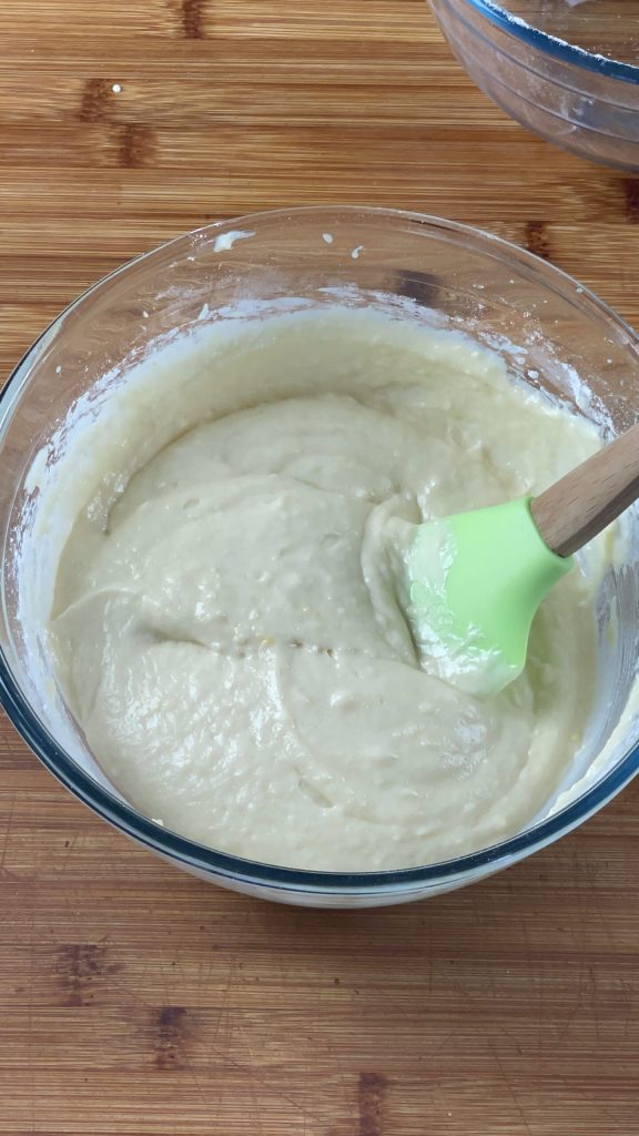 Je kunt een witte Griekse yoghurt, vanille of citroen gebruiken.Voeg de droge ingrediënten in twee of drie keren toe aan de vloeibare ingrediënten, steeds mengend en volledig integrerend vóór de volgende toevoeging.